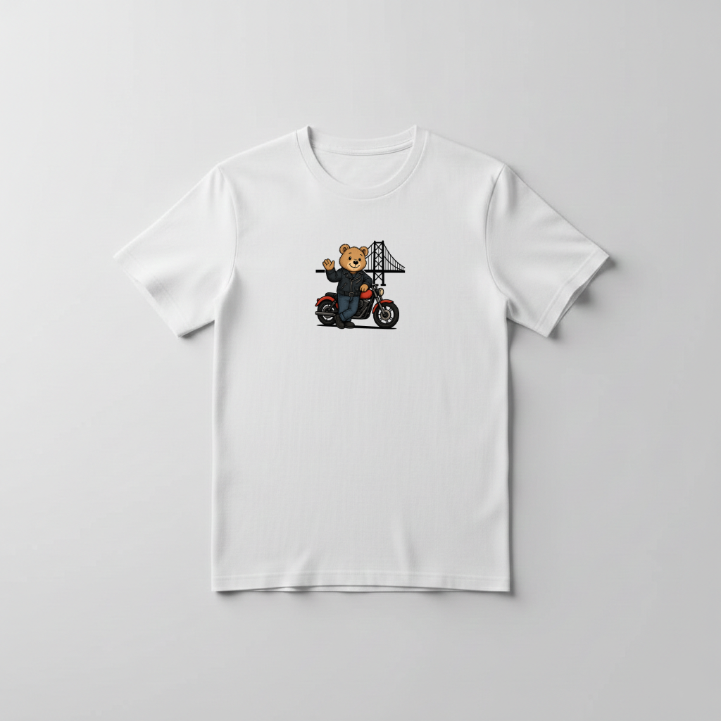 The exclusive graphic on the front features a friendly, smiling cartoon teddy bear in a cool leather jacket, blue jeans and boots, casually leaning against a bright red motorbike, with the iconic silhouette of the 25th of April suspension bridge in the background, adding a touch of classic Portuguese flair and wanderlust.
