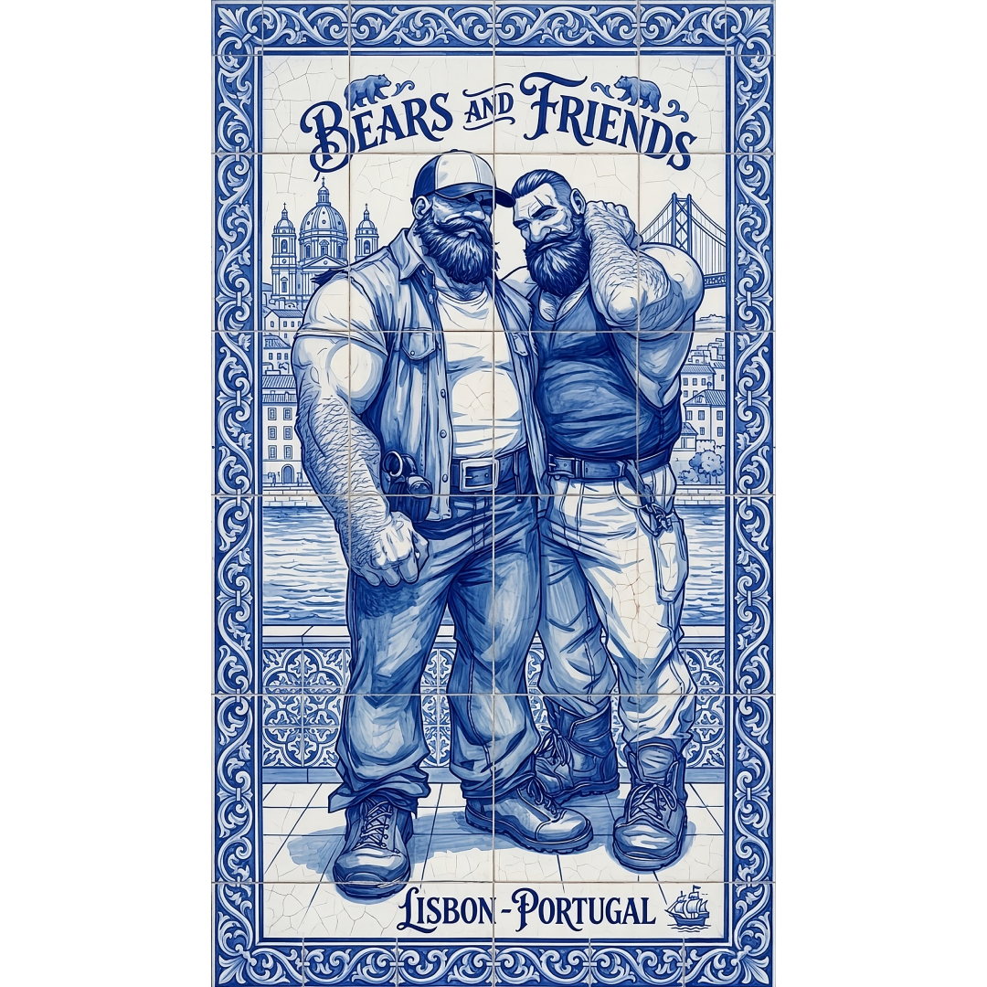 Design: Portuguese azulejo tile-style illustration with “Bears and Friends – Lisbon, Portugal” text