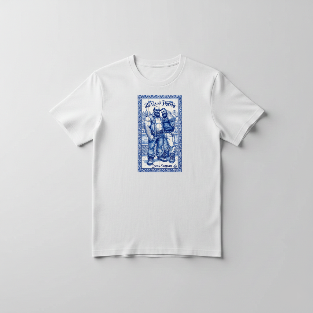 Add character and cultural flair to your wardrobe with this 100% heavyweight cotton T-shirt, featuring a bold chest print inspired by traditional Portuguese azulejo tile art. The design presents two strong, bearded friends standing together in a confident pose, framed by classic blue ceramic tile patterns. Behind them appears the skyline of Lisbon with the iconic Ponte 25 de Abril, while the artwork proudly displays “Bears and Friends – Lisbon, Portugal.”