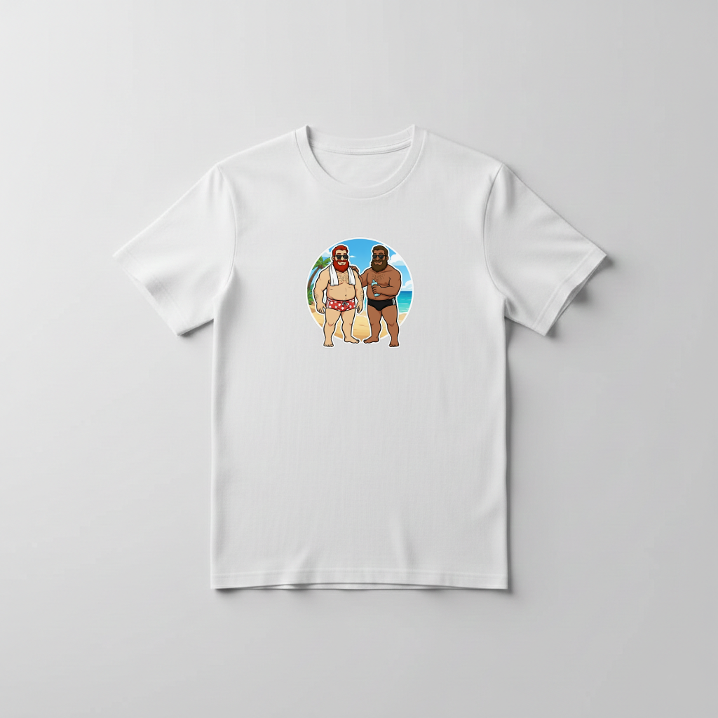 High quality, heavy cotton t-shirt with Bear Guys on the beach with dog patern.