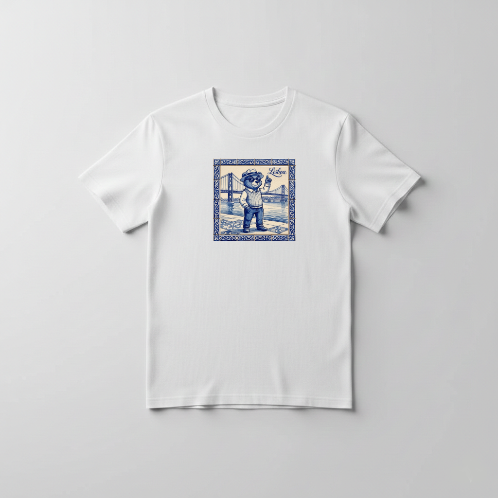 Celebrate the charm of Lisbon with this 100% heavy cotton T-shirt, featuring a unique chest print inspired by traditional Portuguese ceramic art. The design showcases a stylish bear standing proudly in front of the famous Ponte 25 de Abril, illustrated in the classic blue-and-white Portuguese tile (azulejo) style. The artwork captures the iconic riverside view of Lisbon while adding a playful character that makes the design truly distinctive.